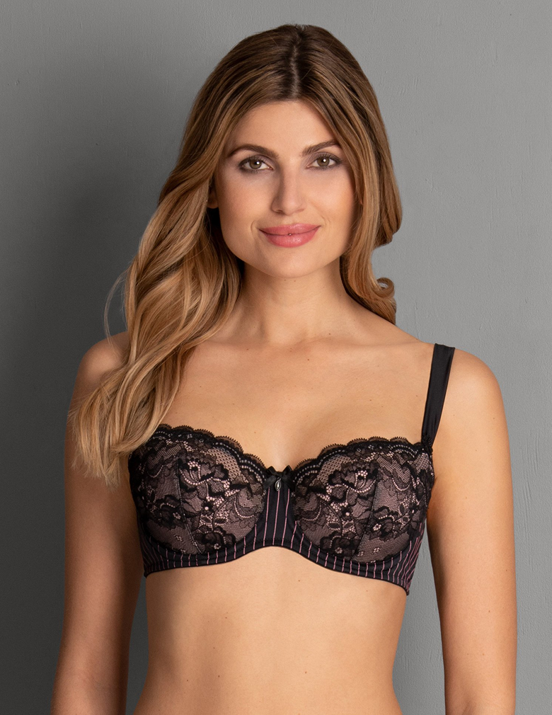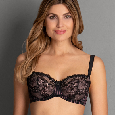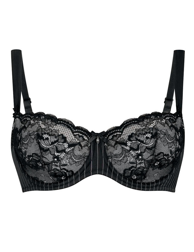 Feminine & seductive! The balconette bra with ¾ cups shapes a plunging, seductive cleavage which expertly highlights the sensuous lace look of the piece. The gorgeously shaped cups made of elasticated, tulle-lined lace have soft, yet firm foam padding for additional support and lift. The pin stripe print on the frame adds an exciting contrast. A cute little bow and decorative pendant on the bridge round off the look of this sensual and very luxurious lingerie.