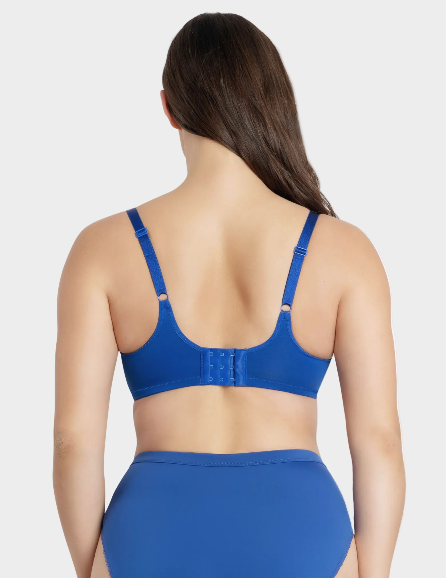 Parfait's Enora in Sapphire is a minimizer bra with medium coverage providing the ultimate support and modesty for the full figured woman. A pretty jacquard lace smooth fabric with unlined seamed 3-part underwire cups, designed to minimize up to 1.5 inches off your bust.
