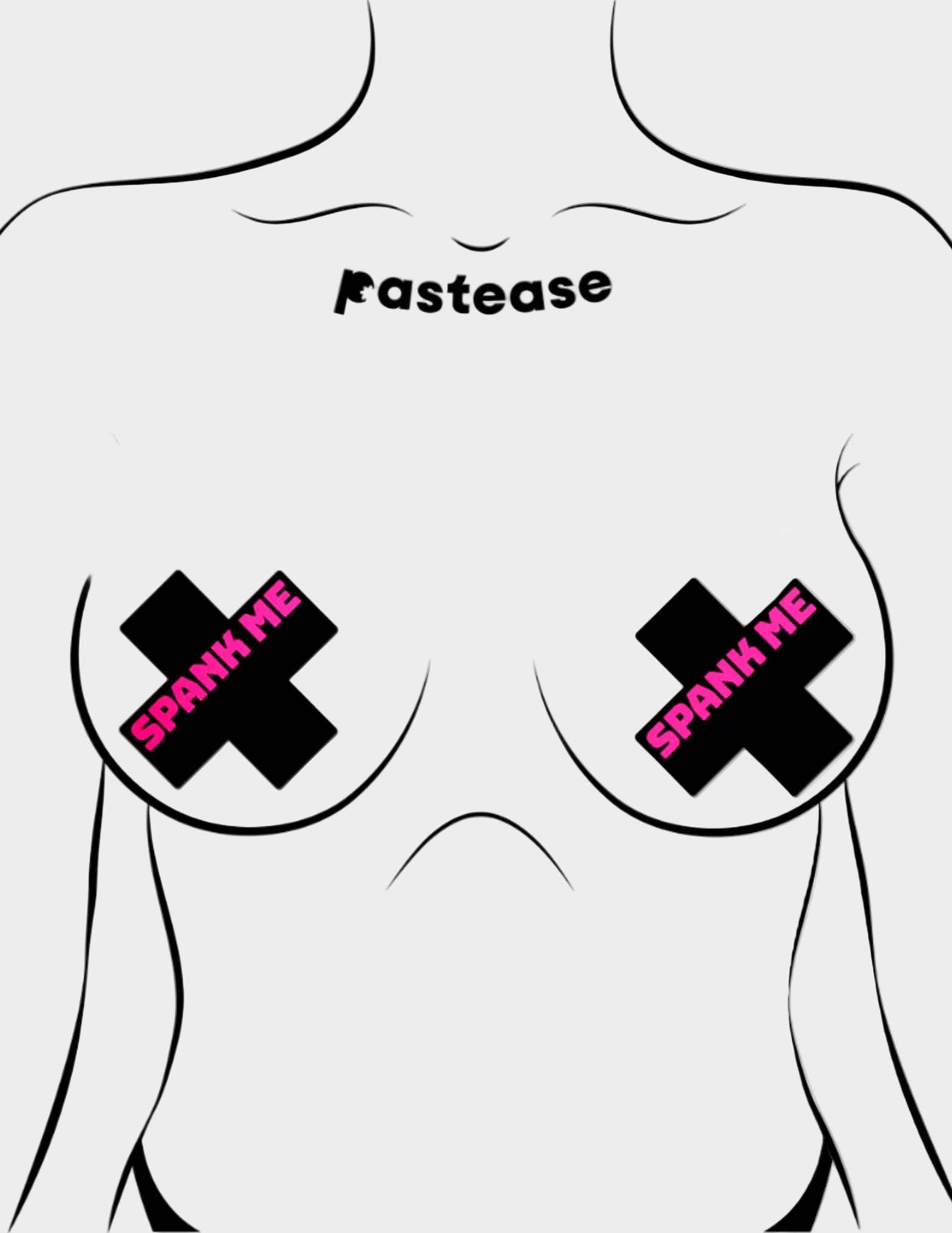 Plus X: Liquid Black Cross with Pink 'Spank Me' Nipple Pasties by Pastease® are hand-made in the USA of soft form-fitting material that forms seamlessly to curves and resists wrinkling over hardening nipples.