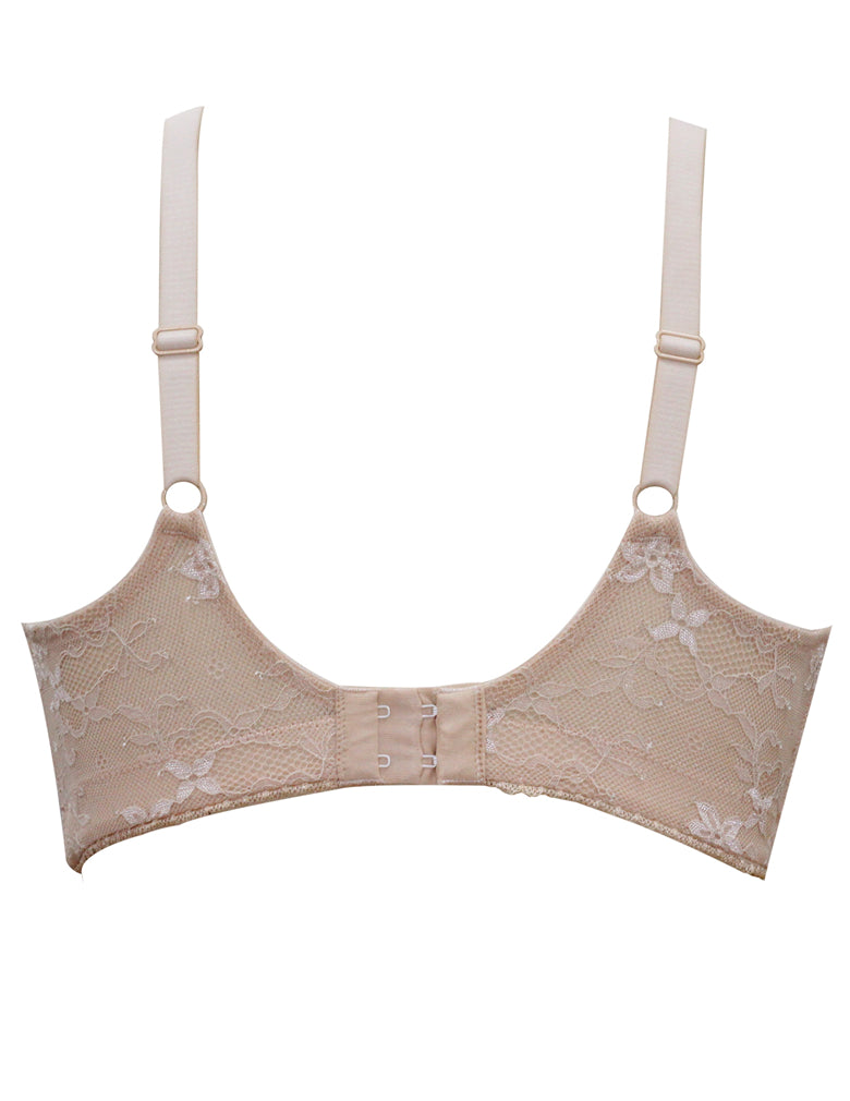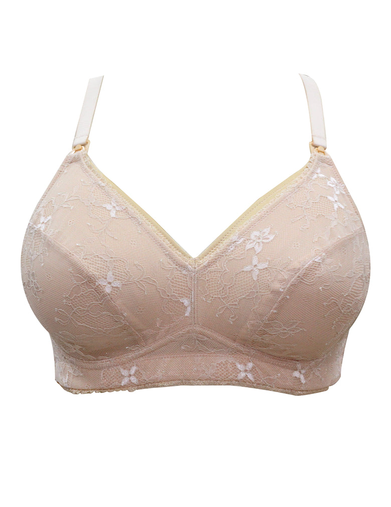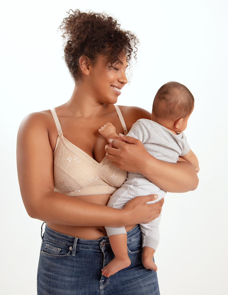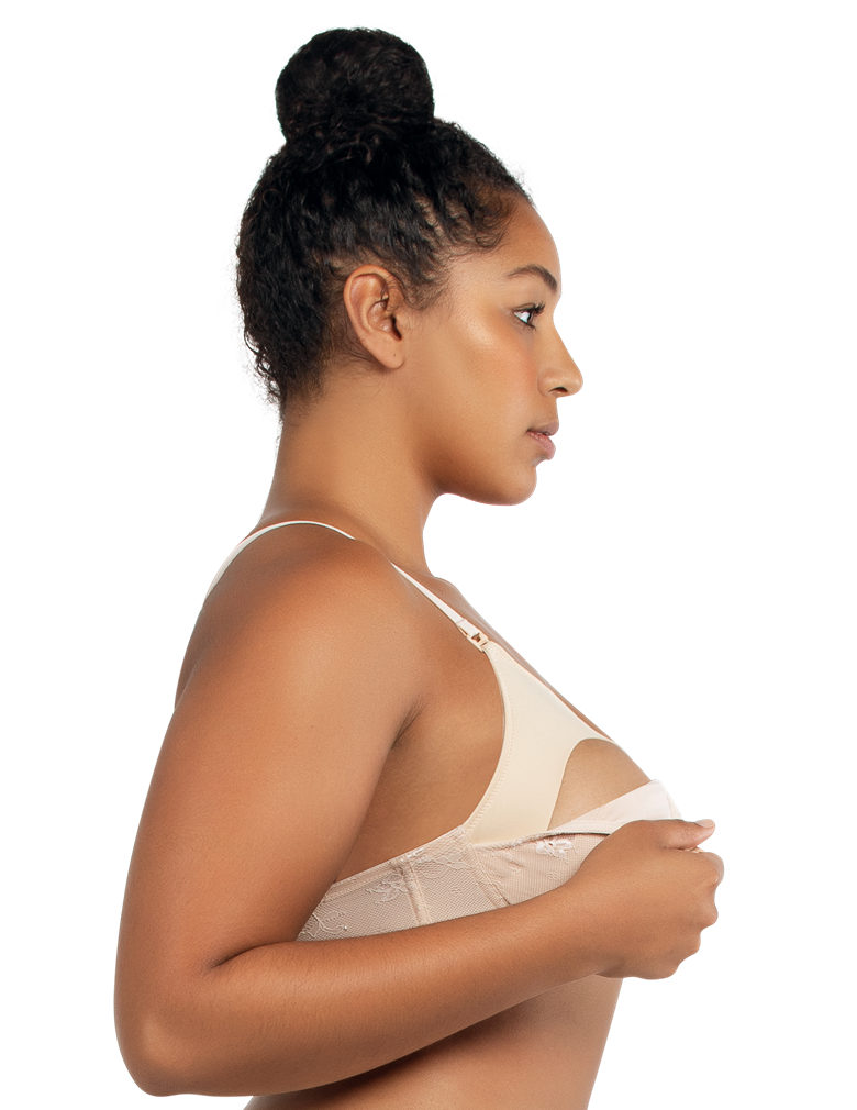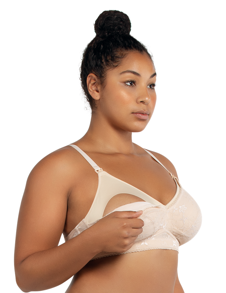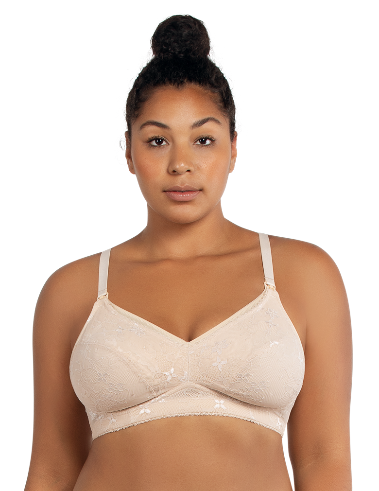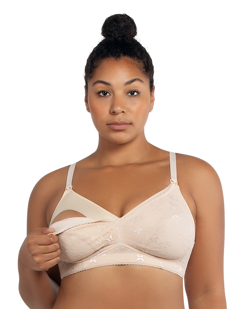 The Parfait Rain Wire Free Nursing Bra in Porcelain features a pretty flower, two tone fabric, and is unlined. The cups are lined with cozy, cotton-like breathable modal fabric which is super soft against the most sensitive skin. The cup includes a pocket to insert a nursing disk. The inner sling gives the bust ongoing support while the sturdy snap easily unhooks with one hand while nursing.