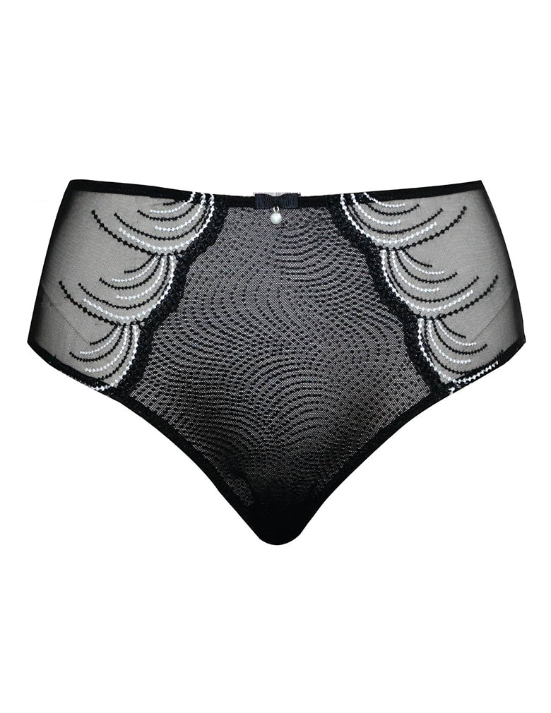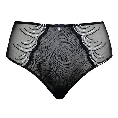 This full coverage high waist and high leg French cut panty in Black slims and elongates with elegant, rich embroidery at the side and tuxedo bow with pearl charm.