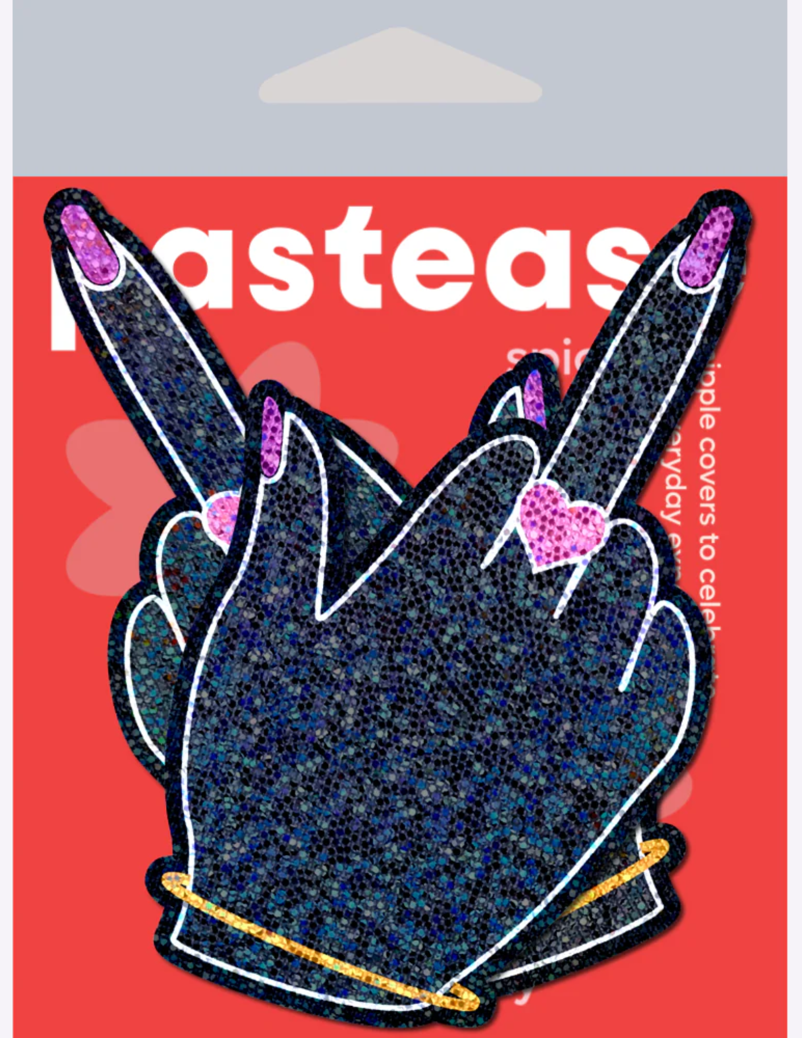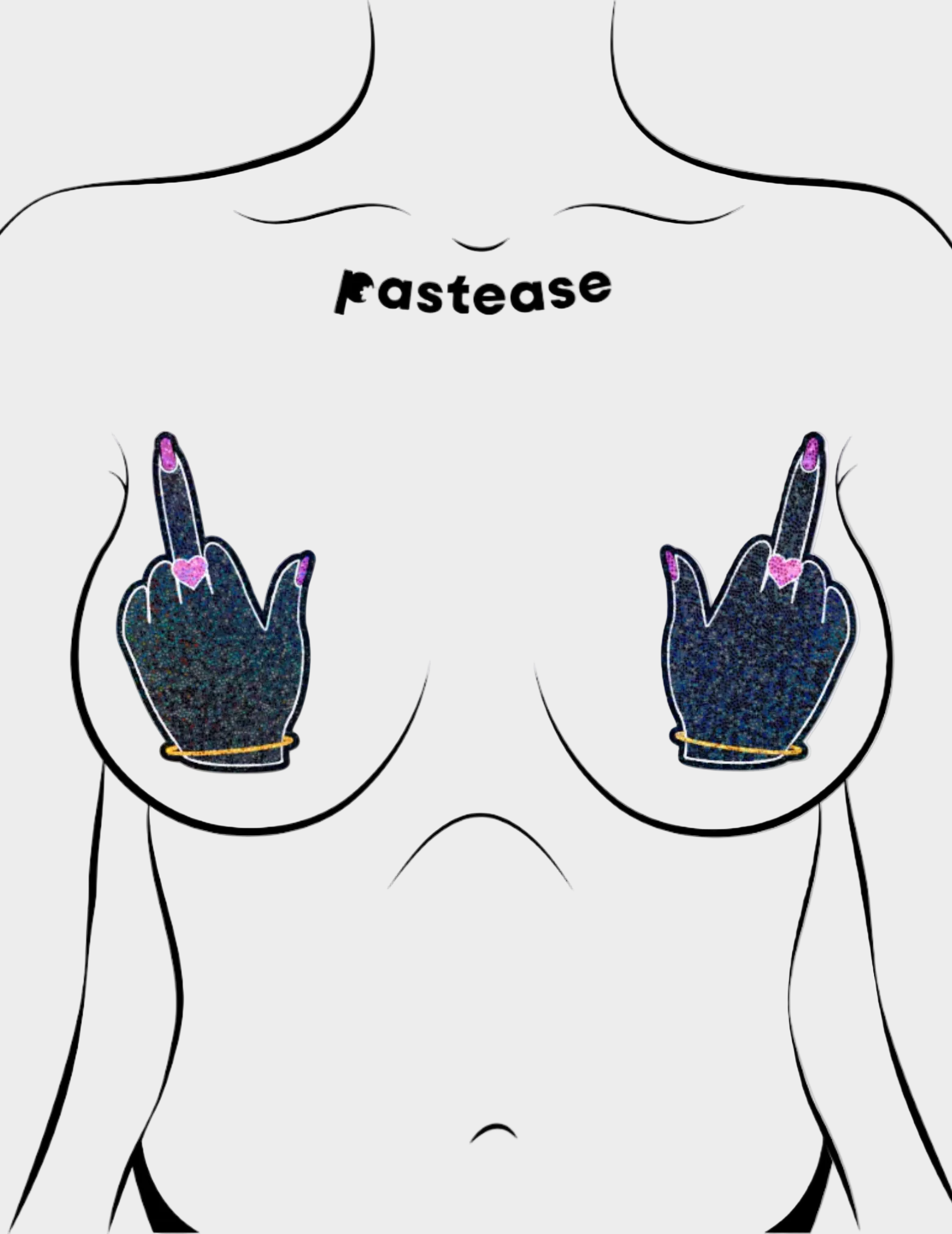 Middle Finger Pasties: Glittering F*ck You Lady Hands Nipple Covers by Pastease® Hand-made in the USA of soft form-fitting material that forms seamlessly to curves and resists wrinkling over hardening nipples. Just peel-and-stick on clean, dry skin.