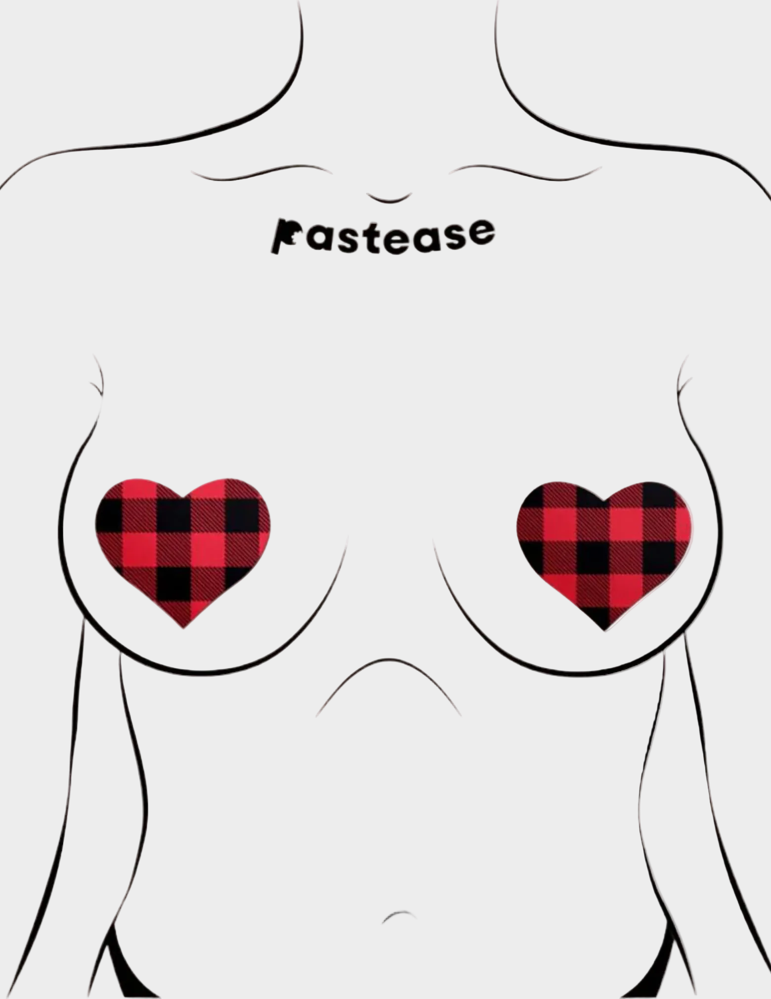 Love: Buffalo Plaid Heart Nipple Pasties in Red & Black by Pastease® Hand-made in the USA of soft form-fitting material that forms seamlessly to curves and resists wrinkling over hardening nipples. Just peel-and-stick on clean, dry skin.