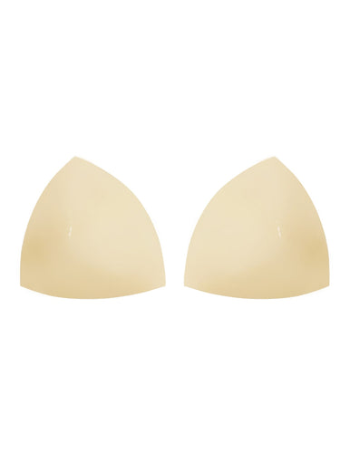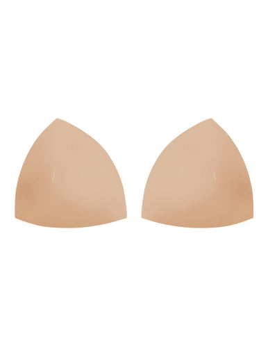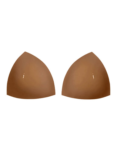 Woman wearing a brown bra and underwear set holding a brown bra insert.