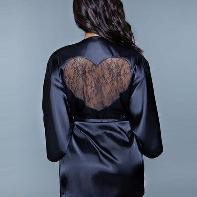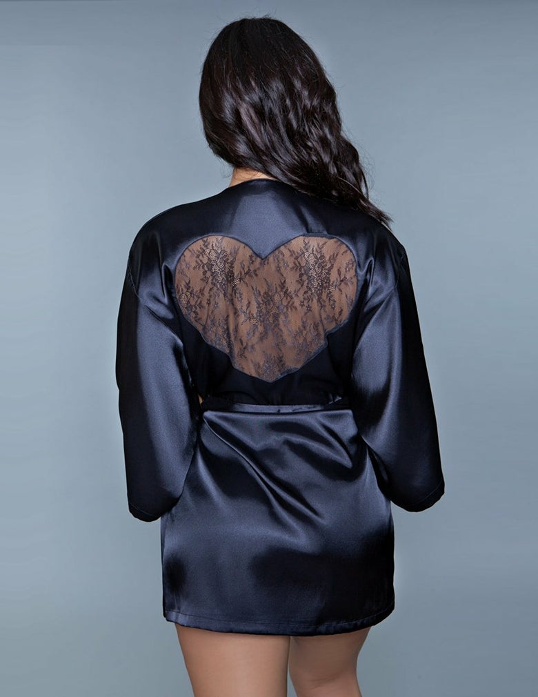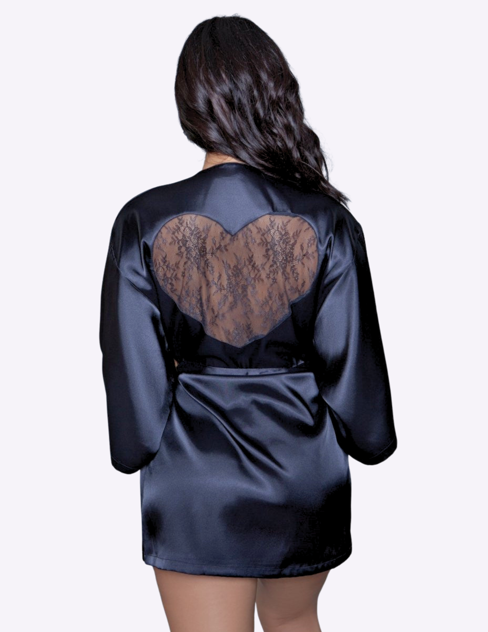 Amora Robe with a lace heart on the back is a stunning piece that combines the smooth, luxurious feel of satin with a touch of romantic elegance. This beautifully crafted robe features a sleek, flowing silhouette that drapes gracefully over the body, enhancing its allure. The highlight of this exquisite garment is the intricate lace heart detail adorning the back, adding a unique and charming touch.