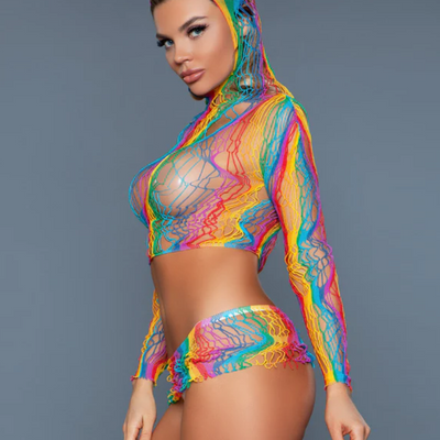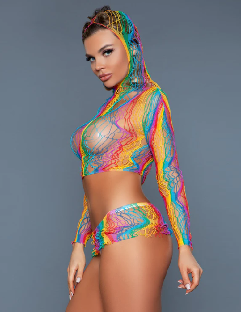 A playful set with a touch of sexy, this set features a tantalizing sheer web pattern that shows what's beneath. The set comes with a hooded crop top and a raw hem mini skirt.