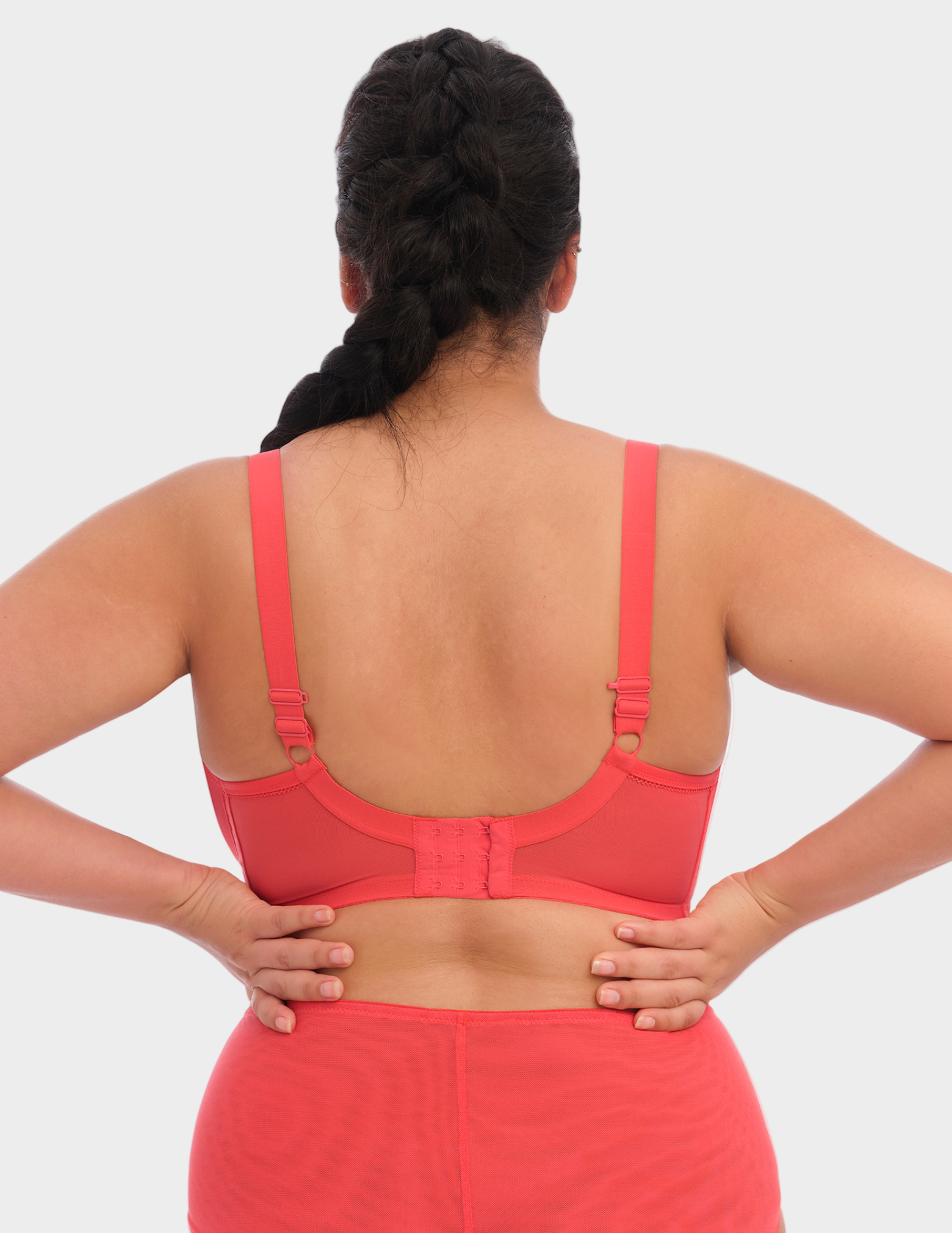 Elomi's must-have Bijou Moulded Bra in Cayenne provides an everyday plunge style without push up. Moulded cups create a beautifully rounded shape in sizes E - H. Elastic trims along the neckline offers a fabulous fit, finished with a moveable J-hook to allow a racerback strap style.