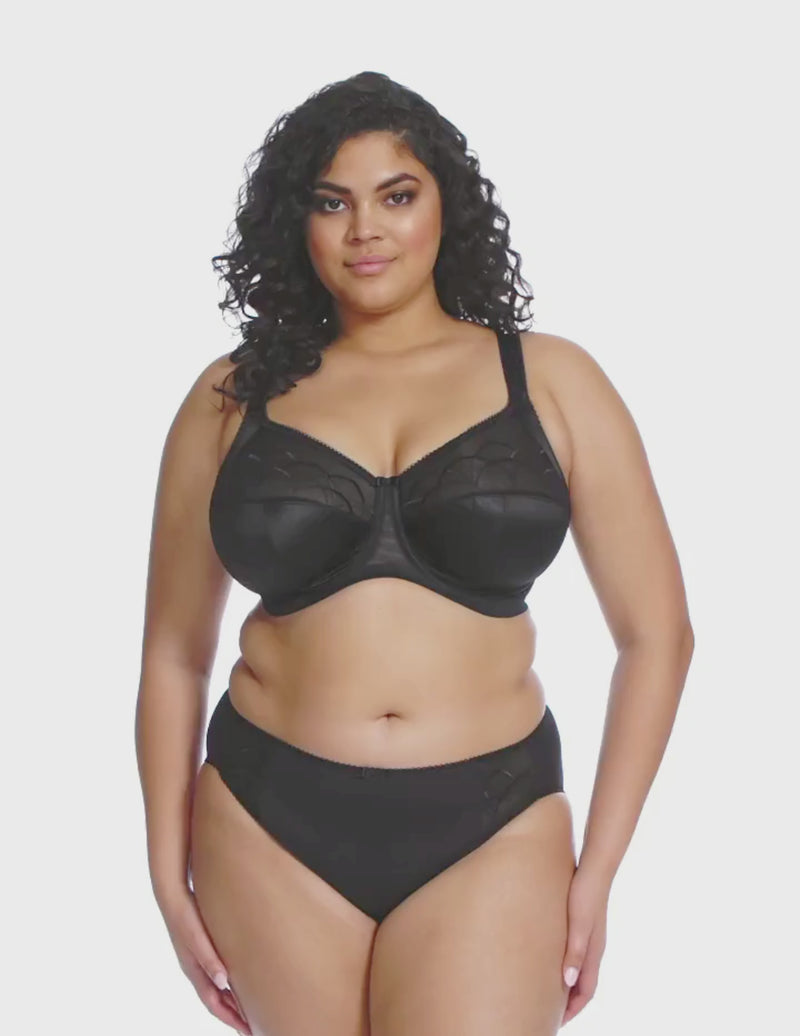 Cate has a fresh look with embroidery featuring intersecting arcs, textured straps and a pretty looped neck edge elastic.