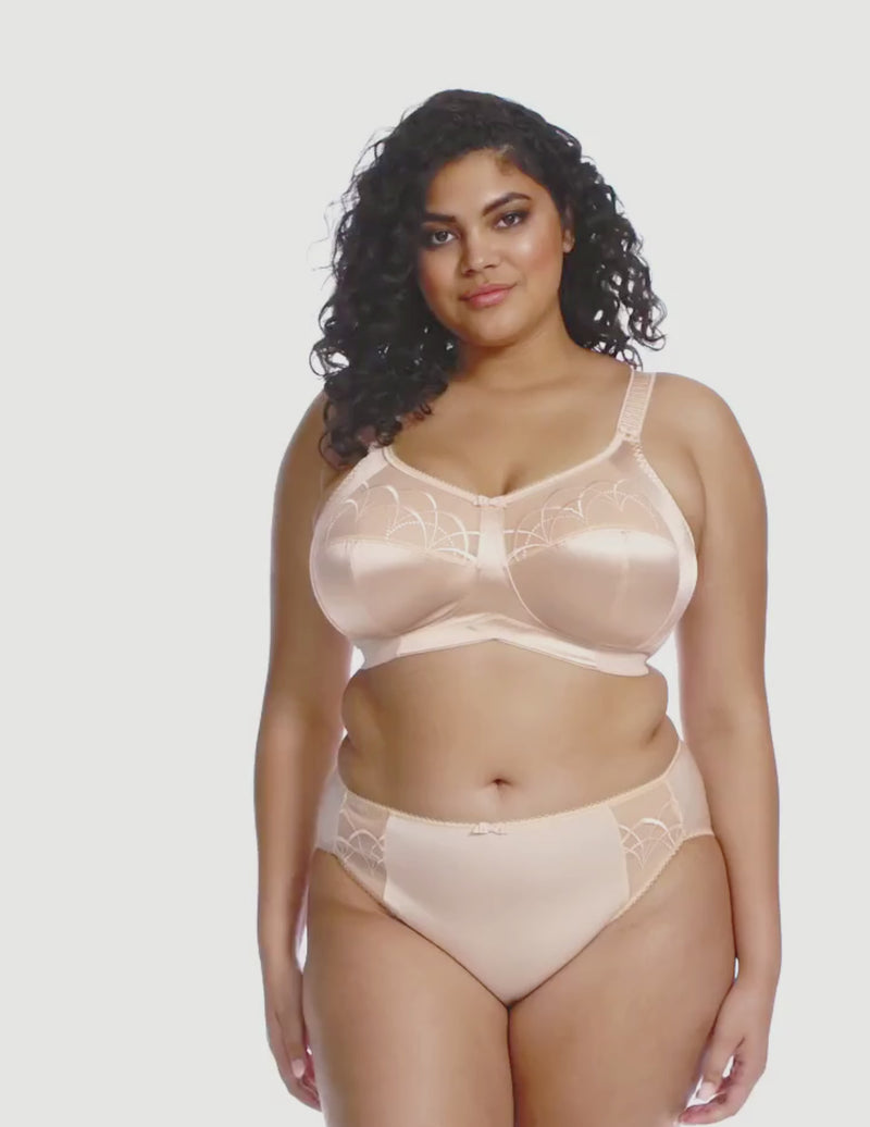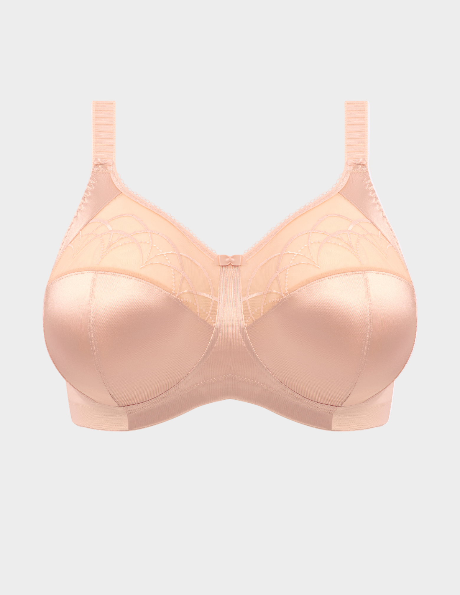Enjoy the look and feel of the Cate Soft Cup Bra in a chic Latte colorway, showcasing sheer embroidery and soft satin for a luxurious look. Cate features a secure elastic underband and flexible side boning for anchorage and support, while three piece cups plus side support provide perfect forward shaping, up lift and separation in cup sizes B - G