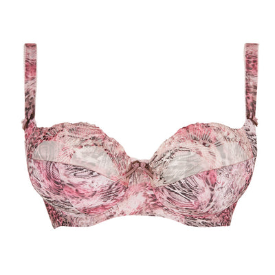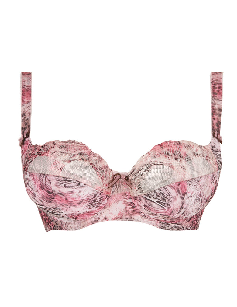 Natalie balconette underwired animal print bra in Samba with Swiss embroidery along the top edge. This bra also has side-support to help give a forward projection. .