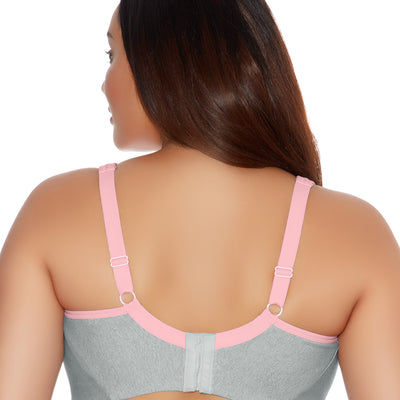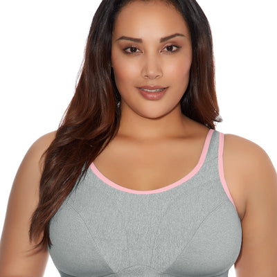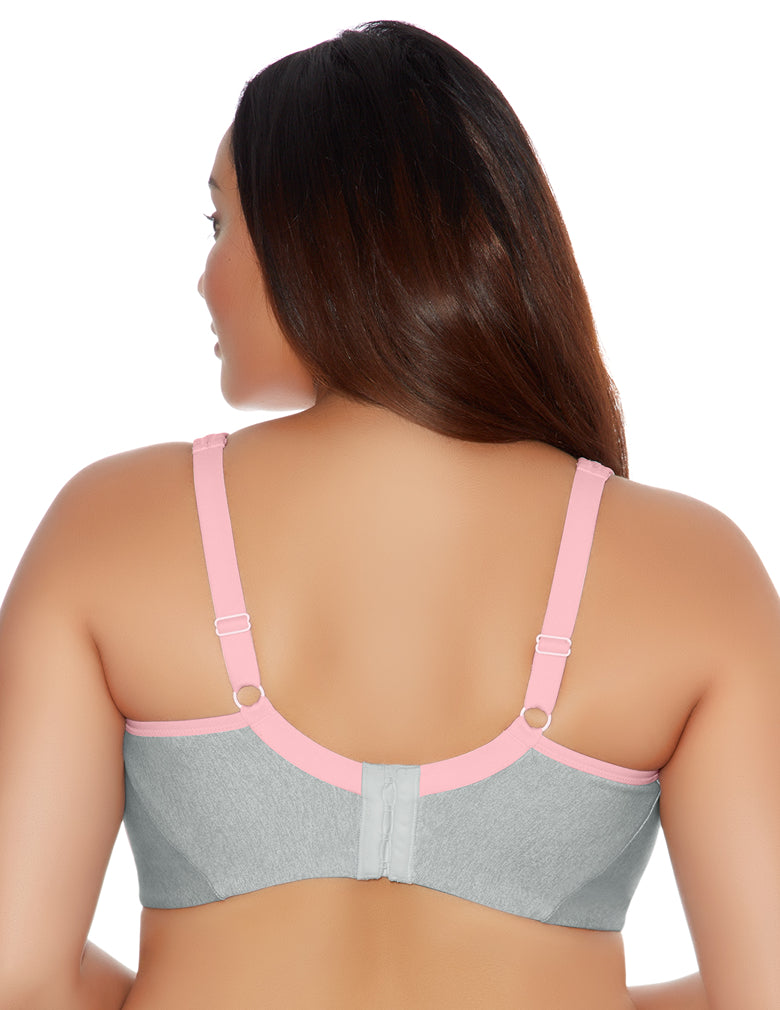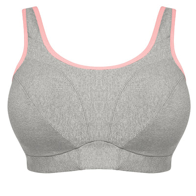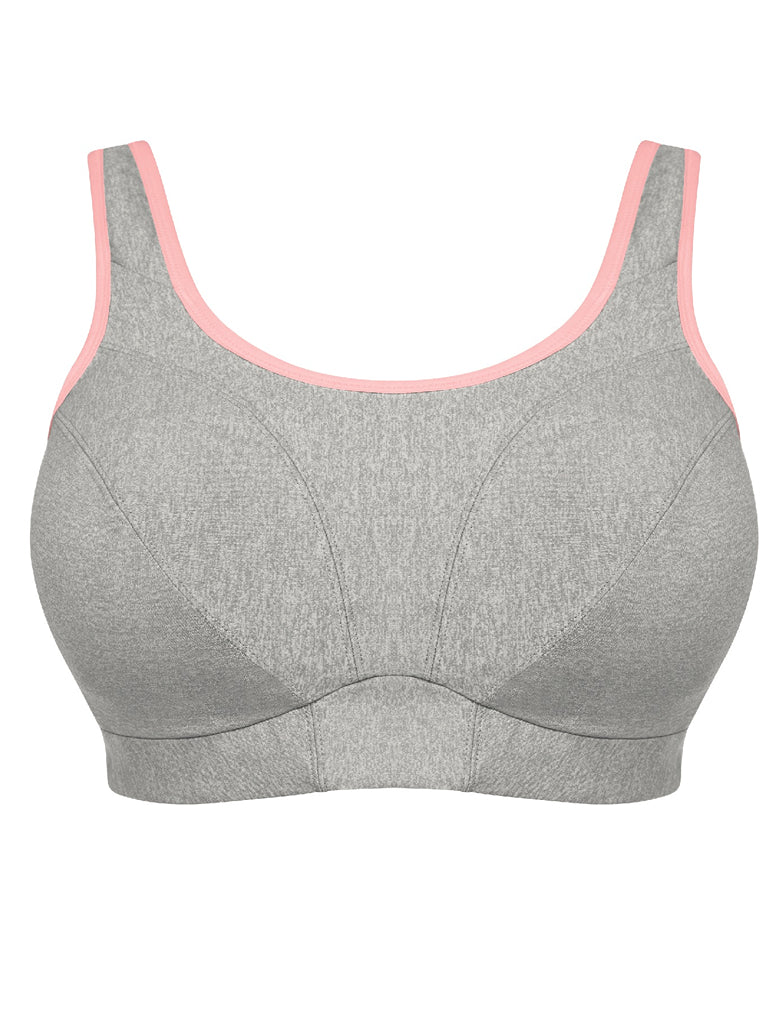 Liven up your workout with Goddess' Soft Cup Sports Bra in Gray Heather, featuring a contrasting pink trim and moisture management properties for a look that combines both fashion and function.