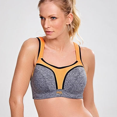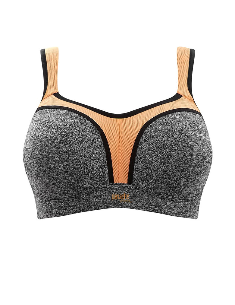 The ultimate sports bra in Grey Mango, especially designed for the full busted women combines comfort, maximum support and reduces bounce by 83 percent. Rather than compressing your breasts against your rib cage like most sports bras, Panache sports bra individually encapsulate each breast lifting, shaping and supporting from all sides
