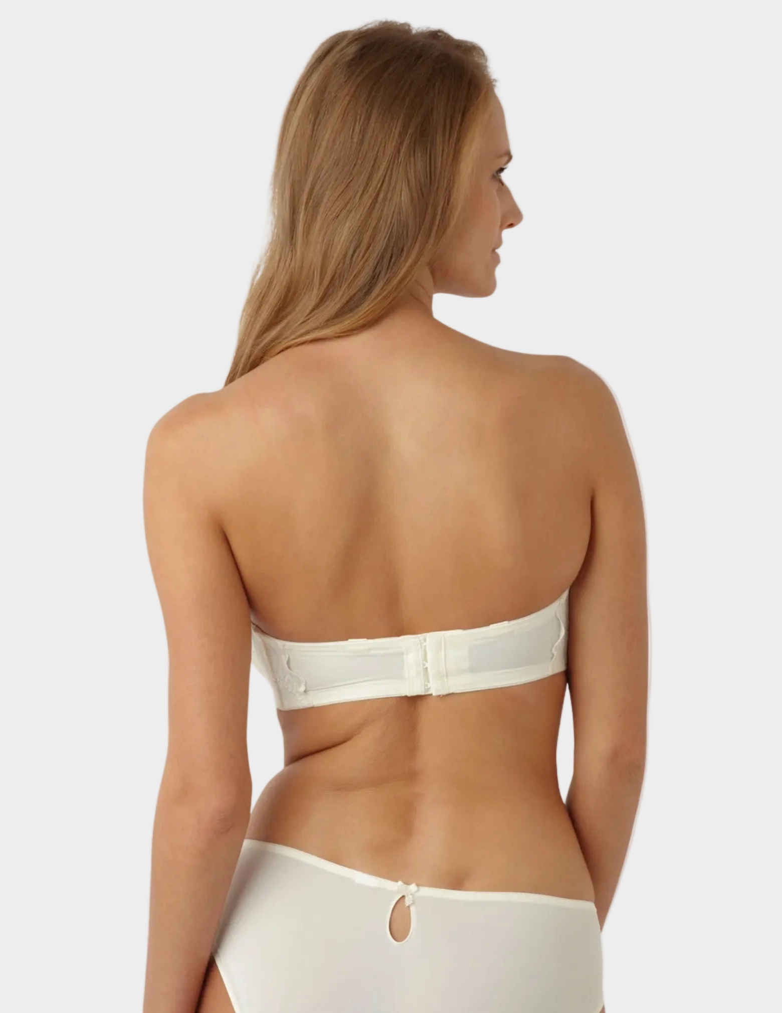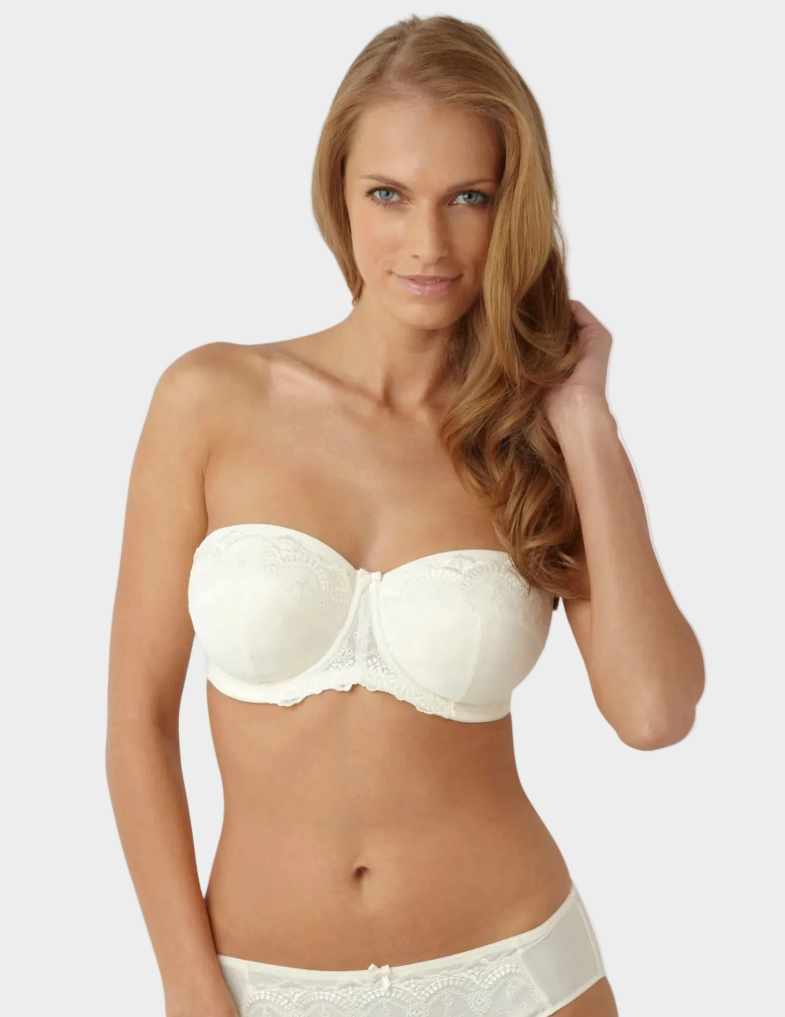 Panache Evie Bridal Strapless Bra 6110 in Ivory. Gorgeous strapless bra. Straps included. Three section cups for nice shape. Padded cups give discreet coverage. Lovely trim on top of cups give an elegant touch to cups.