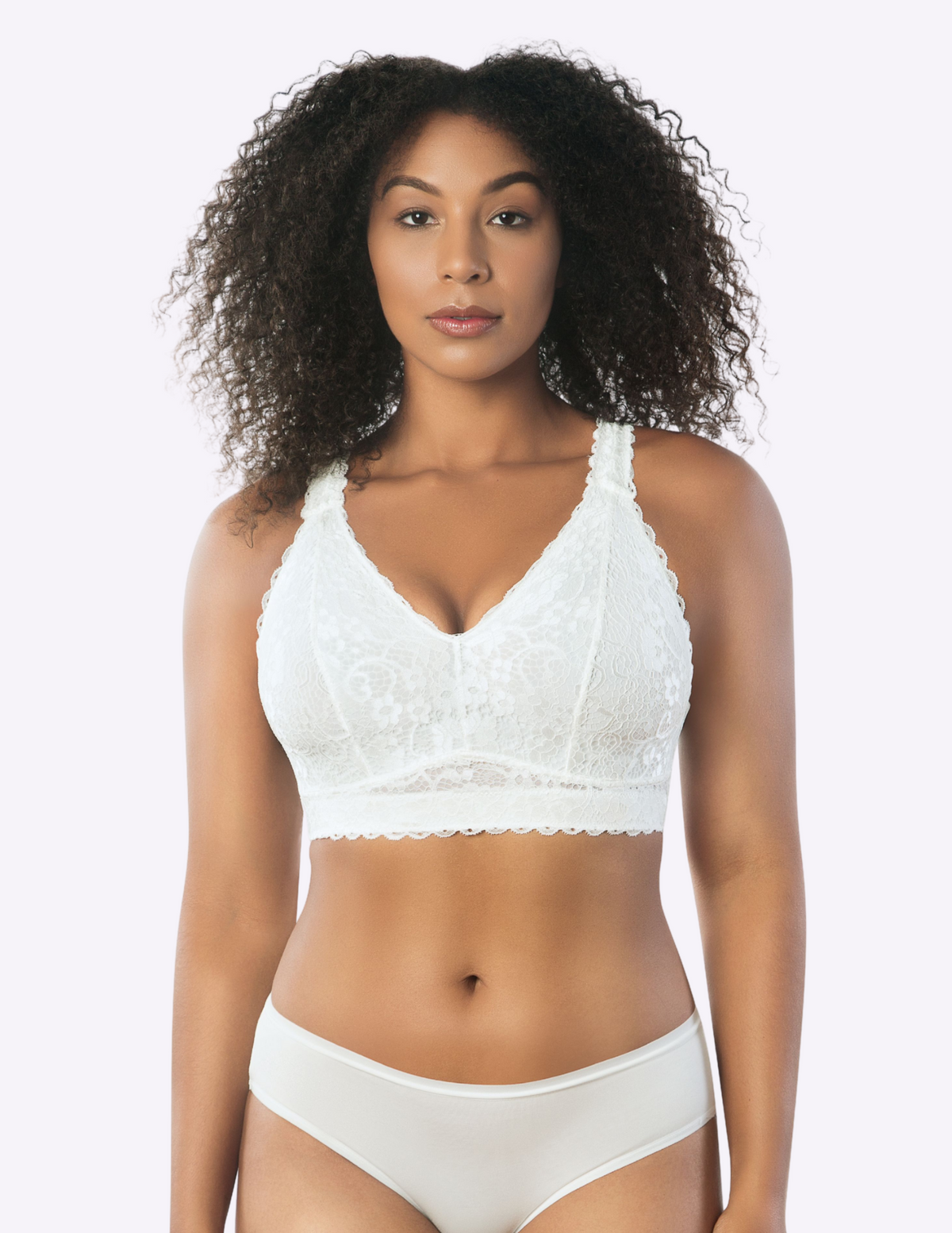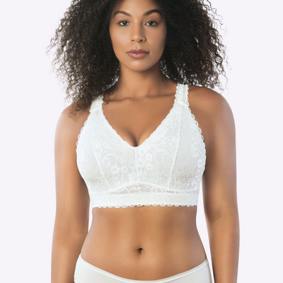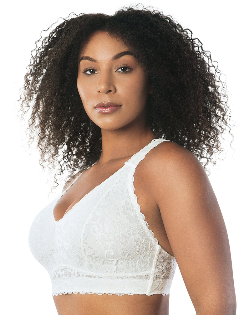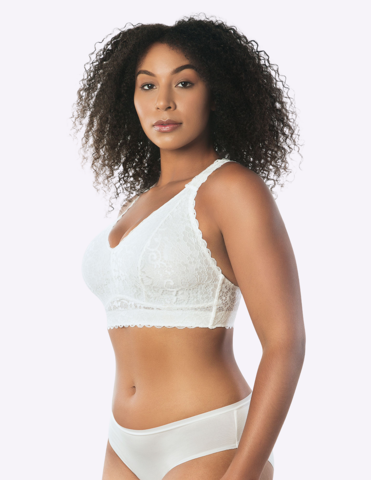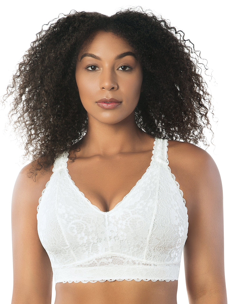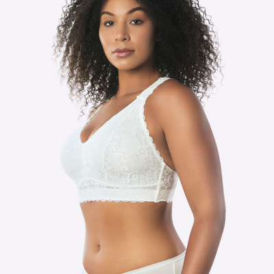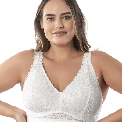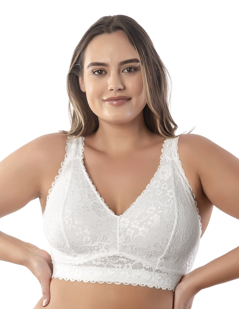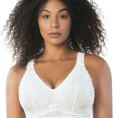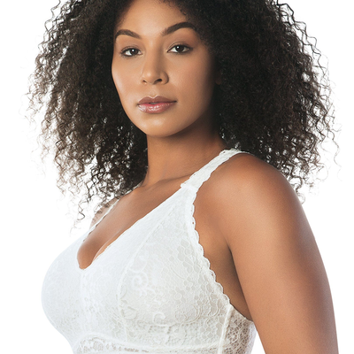 Pretty and Lacy, this wire-free bralette is very supportive and super comfortable. The convertible J-hook feature allows for a racerback option. Adriana in Pearl White is especially designed for full busted and full figure women.