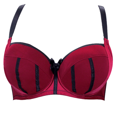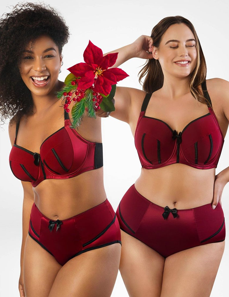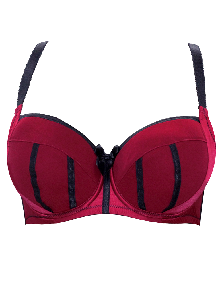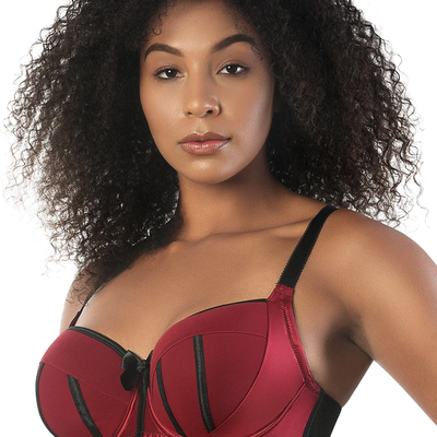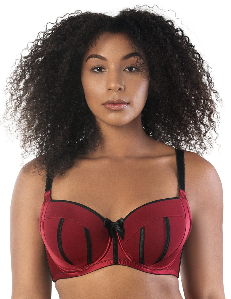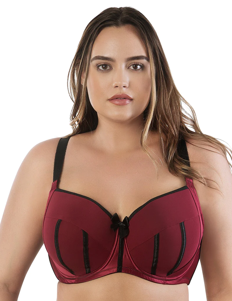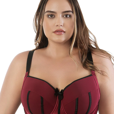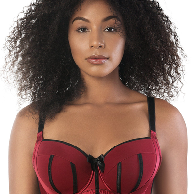 Designed for the full-busted and full-figure woman, this underwire bra features 3-part cups with light to medium foam padding. Padding is slightly thicker at top of cups, which is a great solution for breasts lacking in upper volume. Matte cups in Rio Red contrast with satin side support panels along outside of cups.