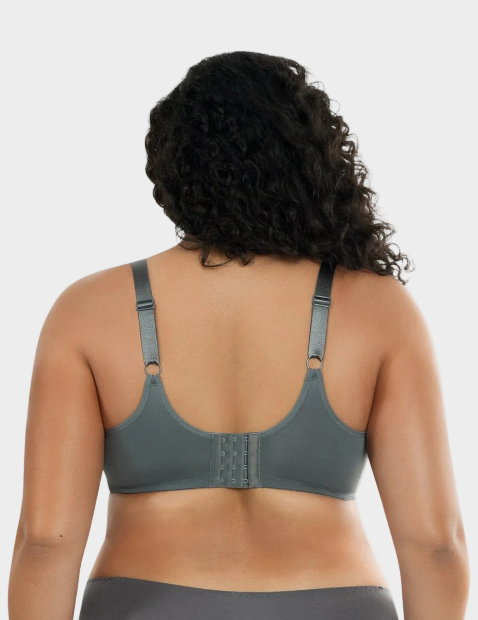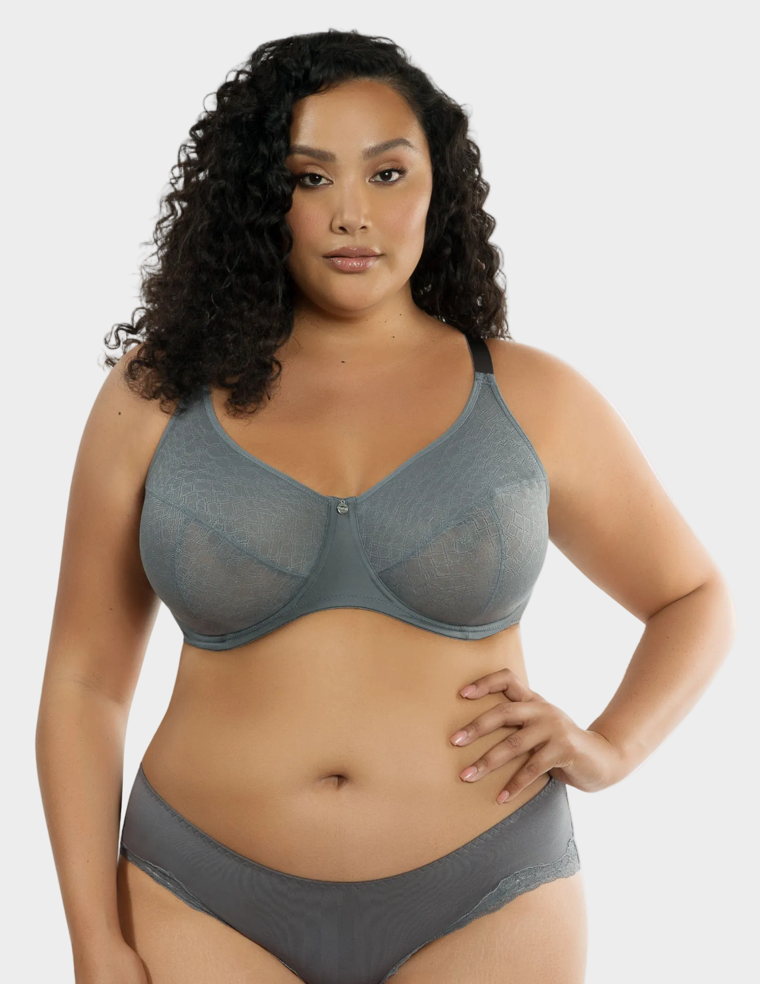 Parfait's Enora in Charcoal is a minimizer bra with medium coverage providing the ultimate support and modesty for the full figured woman. A pretty jacquard lace smooth fabric with unlined seamed 3-part underwire cups, designed to minimize up to 1.5 inches off your bust.