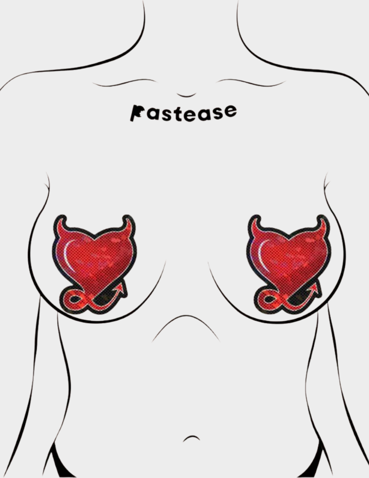 Devil Heart: Red Glittering Hearts with Horns & Tail Nipple Pasties by Pastease® are hand-made in the USA of soft form-fitting glittery material that forms seamlessly to curves and resists wrinkling over hardening nipples.