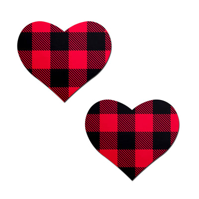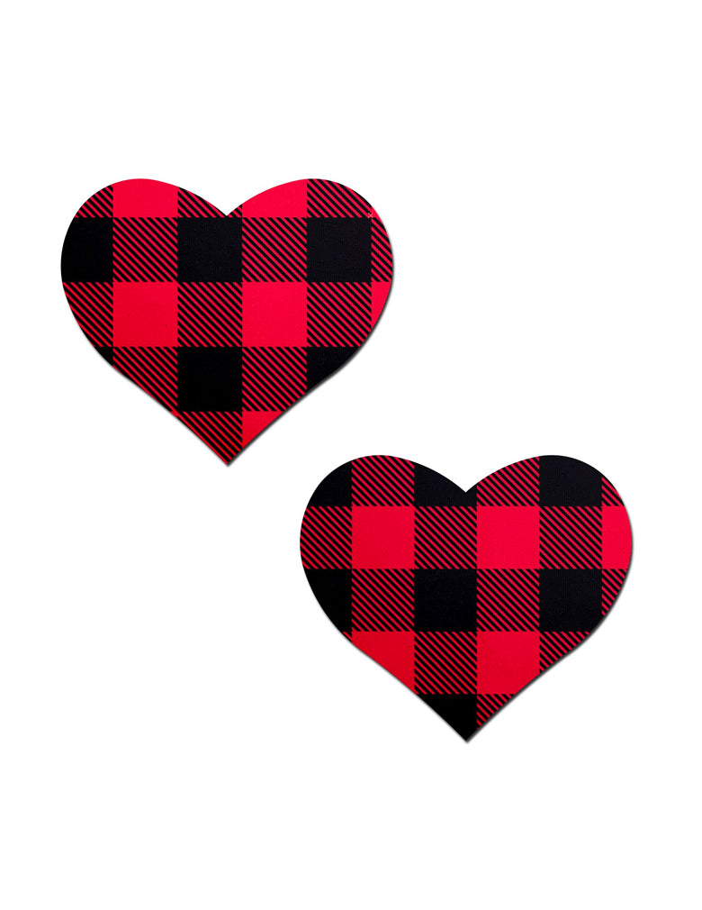Love: Buffalo Plaid Heart Nipple Pasties in Red & Black by Pastease® Hand-made in the USA of soft form-fitting material that forms seamlessly to curves and resists wrinkling over hardening nipples. Just peel-and-stick on clean, dry skin.