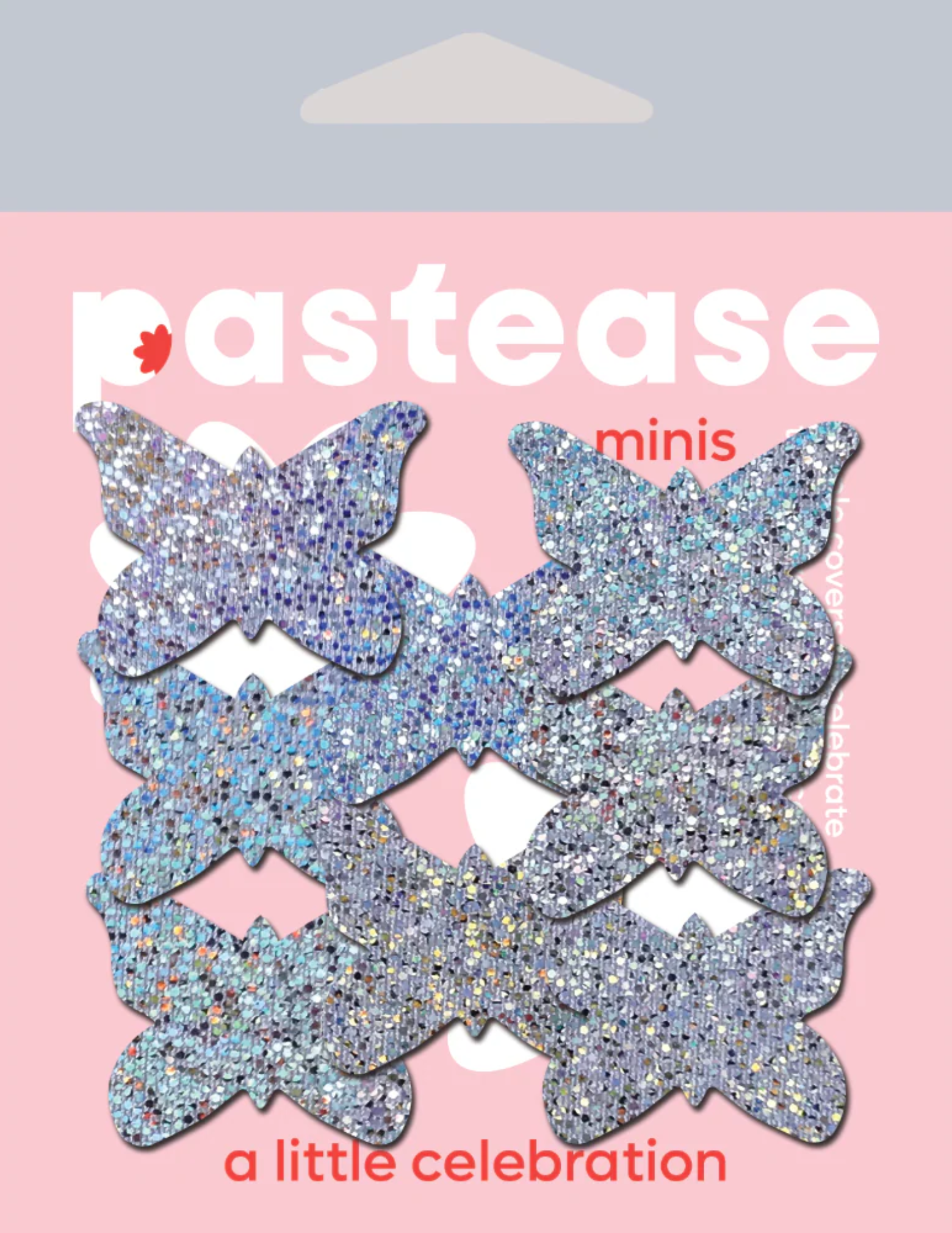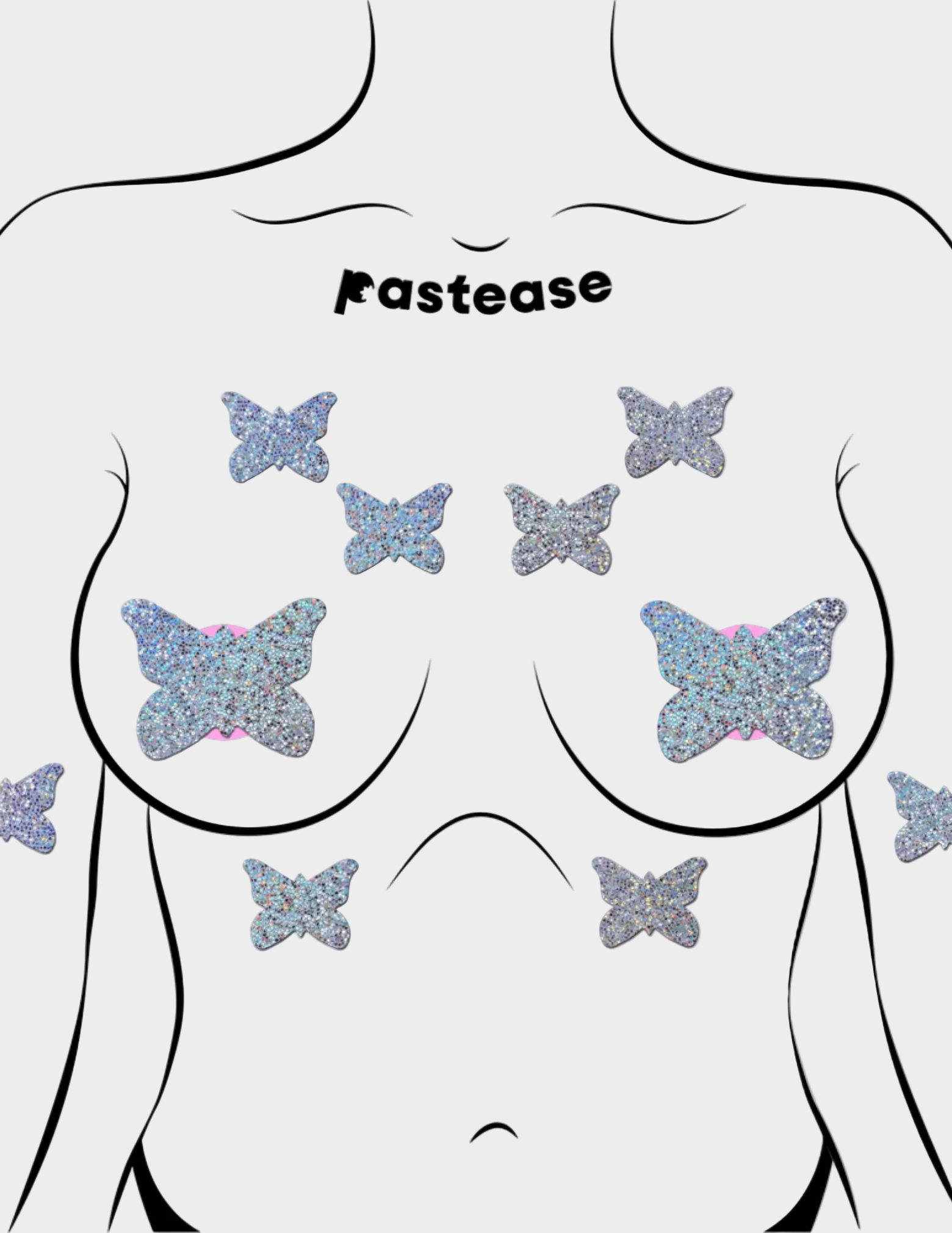 10 Mini Silver Glitter Butterflies Nipple & Body Pasties by Pastease® are hand-made in the USA of soft form-fitting glittery material that forms seamlessly to curves and resists wrinkling over hardening nipples.