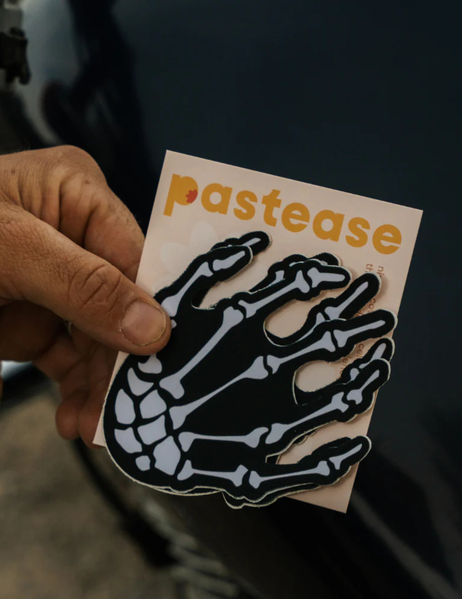 White Boney Skeleton Hands by Pastease® are hand-made in the USA of soft form-fitting material that forms seamlessly to curves and resists wrinkling over hardening nipples.